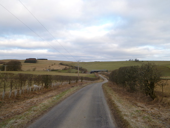 2 - Continue out of Hawick on the Stirches, past a large driveway with lamps on the stone gate posts to a cross roads. Continue straight ahead and where the tarmac lanes bear left after passing a large agricultural building on the right, keep ahead passing under telephone wires.